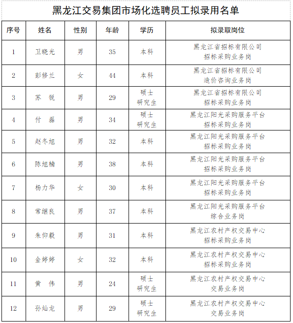 按照黑龍江交易集團(tuán)有限公司2023年度員工招聘計(jì)劃,結(jié)合黑龍江省省市縣三級(jí)聯(lián)動(dòng)大型招聘會(huì)暨第四屆春風(fēng)云聘會(huì)活動(dòng),經(jīng)報(bào)名、資格審查、筆試、面試等環(huán)節(jié),確定了擬錄用人員。現(xiàn)對(duì)擬錄用人員信息進(jìn)行公示,名單如下。